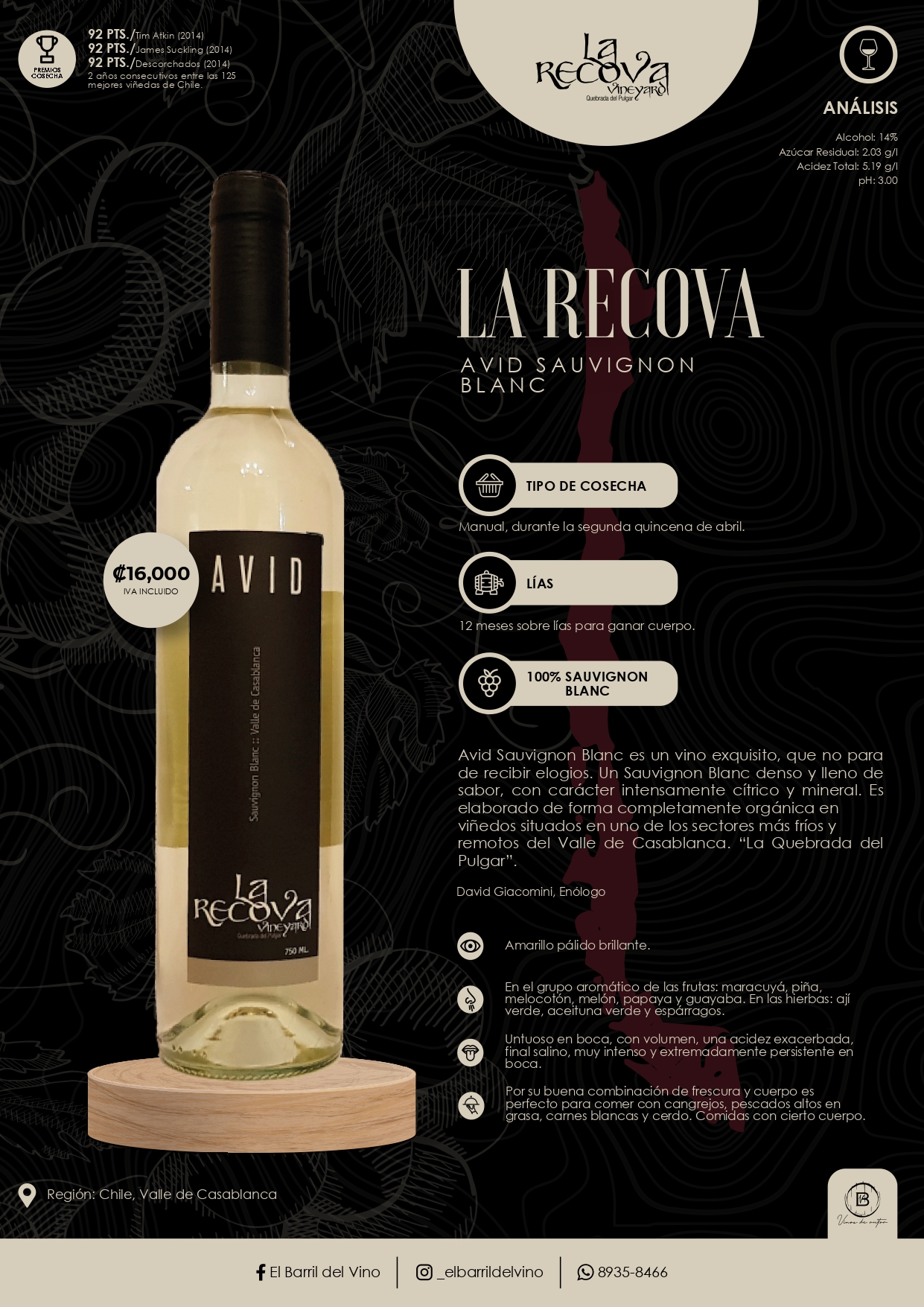 Avid Sauvignon Blanc es un vino exquisito, que no deja de recibir elogios. Denso y lleno de sabor, con carácter intensamente cítrico y mineral. Elaborado de forma completamente orgánica en viñedos situados en uno de los sectores más fríos y remotos del Valle de Casablanca, “La Quebrada del Pulgar”.