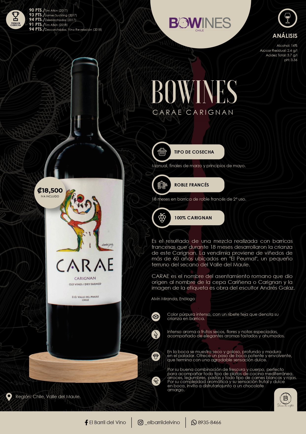 Carae Carignan proviene de viñedos de más de 60 años ubicados en “El Peumal”, Valle del Maule. Criado durante 18 meses en barricas francesas de 2° uso, este Carignan desarrolla complejidad y elegancia. Su nombre hace referencia al asentamiento romano Carae, origen de la cepa Cariñena, y la etiqueta es obra del escultor Andrés Galaz.