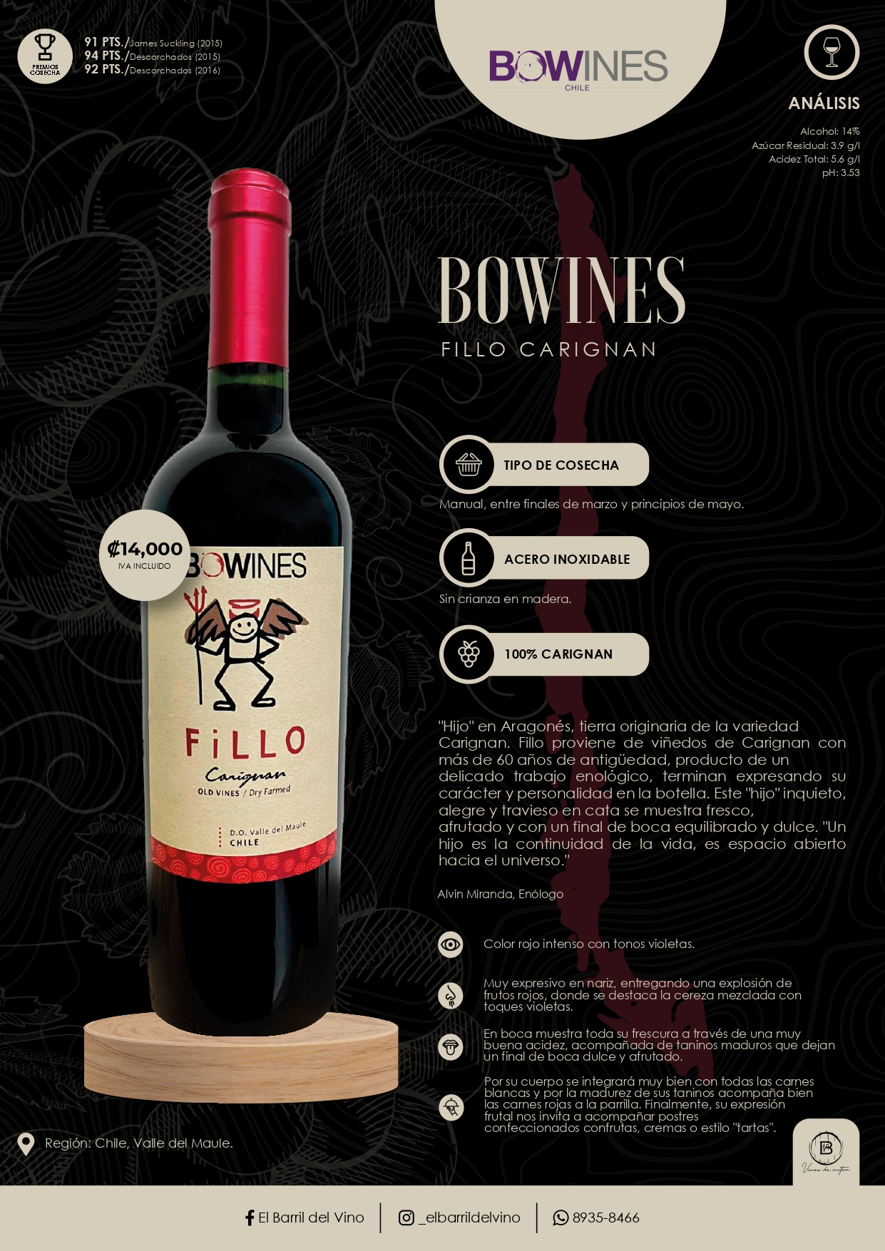 Un Carignan fresco, expresivo y afrutado, con taninos maduros y un final dulce, ideal para carnes, parrilladas y postres frutales.