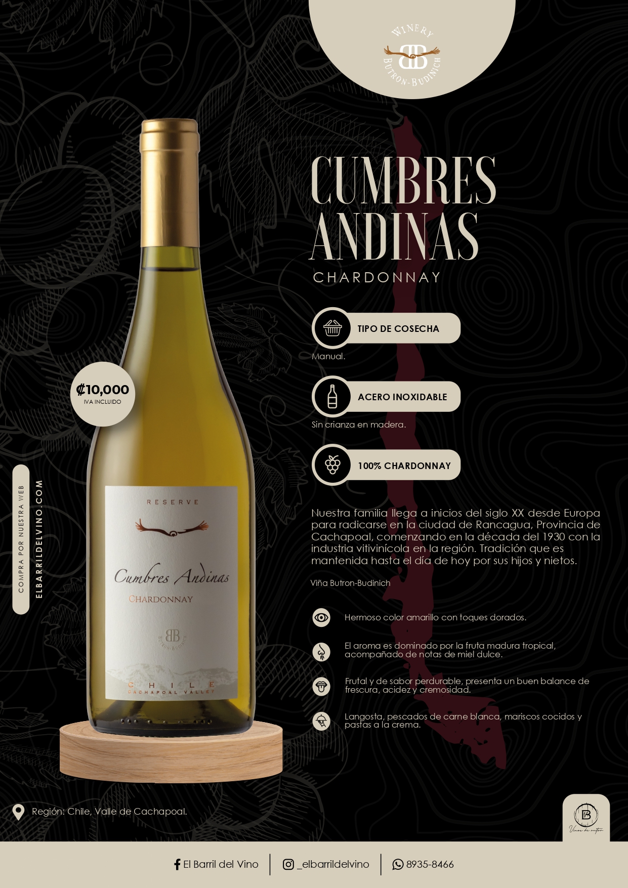 Un Chardonnay elegante y frutal, con aromas tropicales y notas de miel, equilibrado y cremoso, ideal para maridar con mariscos, pescados y platos a la crema.