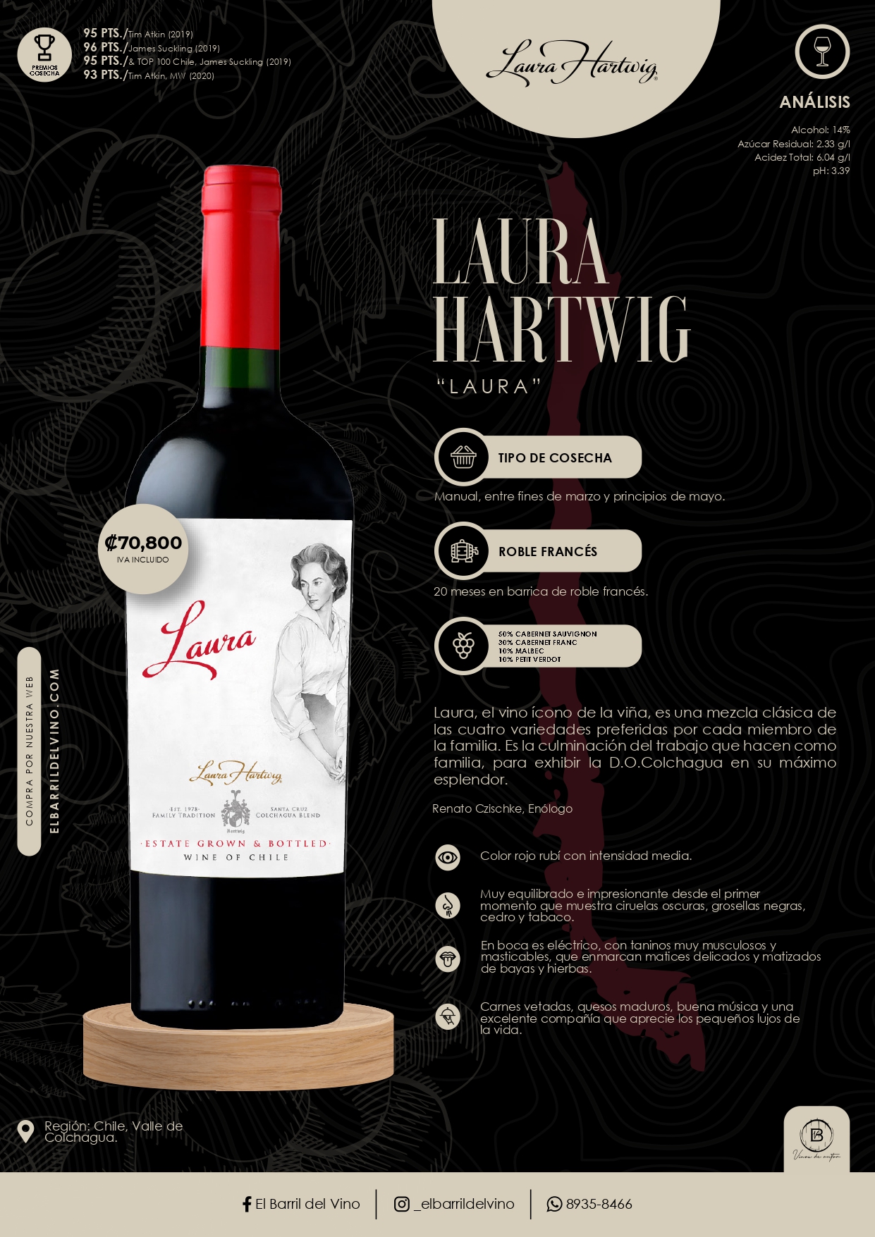 Laura, el vino ícono de la viña, es una mezcla clásica de las cuatro variedades preferidas por cada miembro de la familia. Representa la culminación del trabajo familiar y exhibe la Denominación de Origen Colchagua en su máximo esplendor, con elegancia, complejidad y balance.