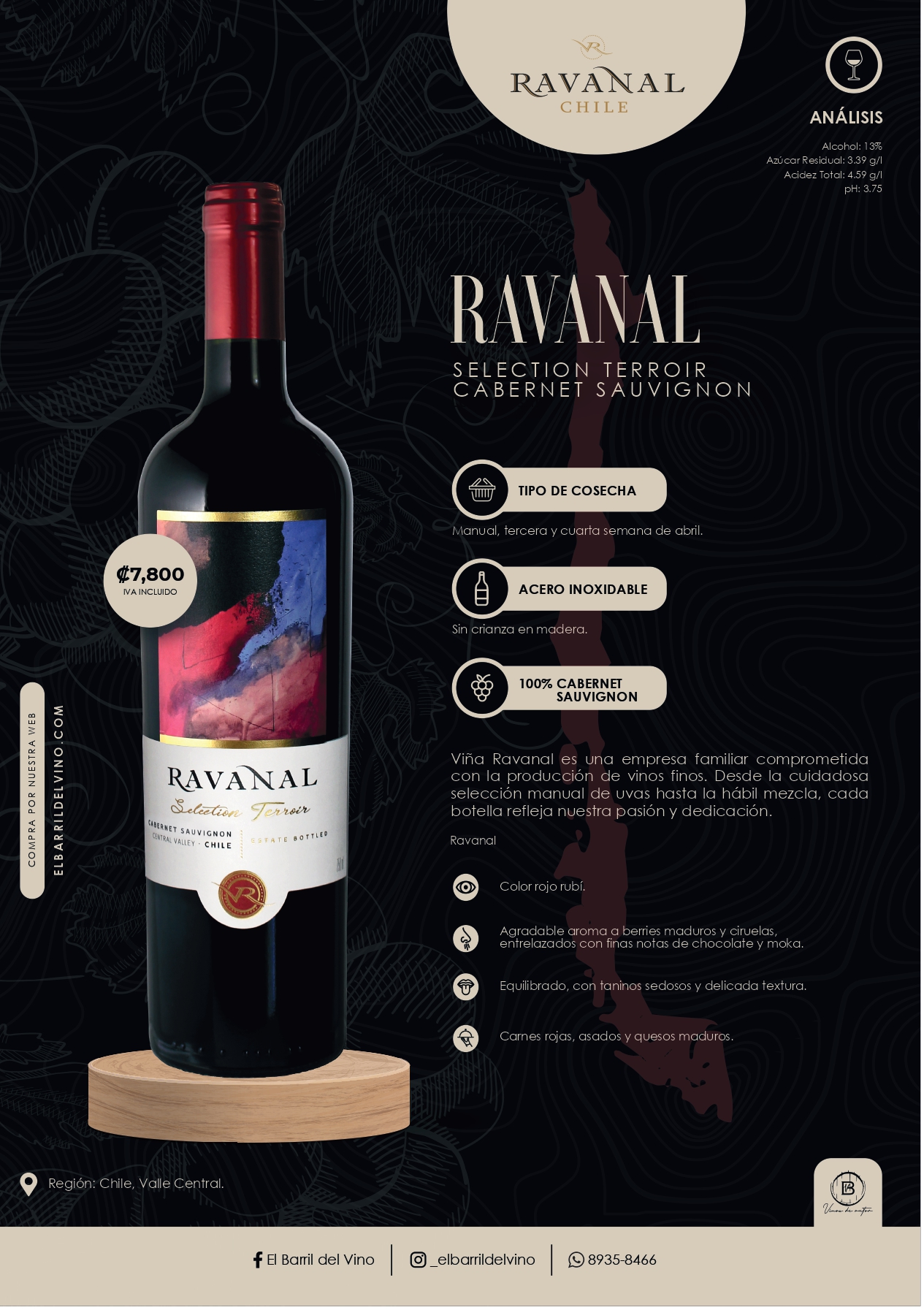 Un Cabernet Sauvignon de color intenso y aromas complejos a frutas maduras y notas de chocolate, con taninos suaves y un final persistente. Ideal para acompañar carnes y quesos curados.