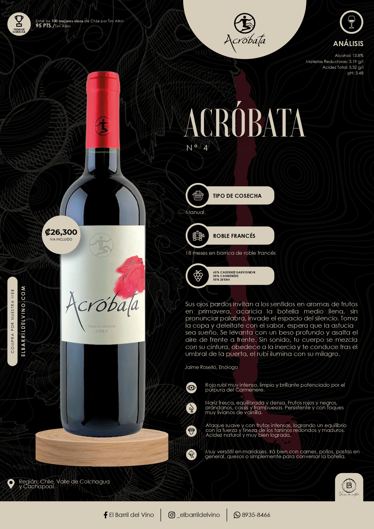 Acróbata es un vino muy versátil en maridajes. Irá bien con carnes, pollos, pastas en general, quesos o simplemente para conversar la botella.