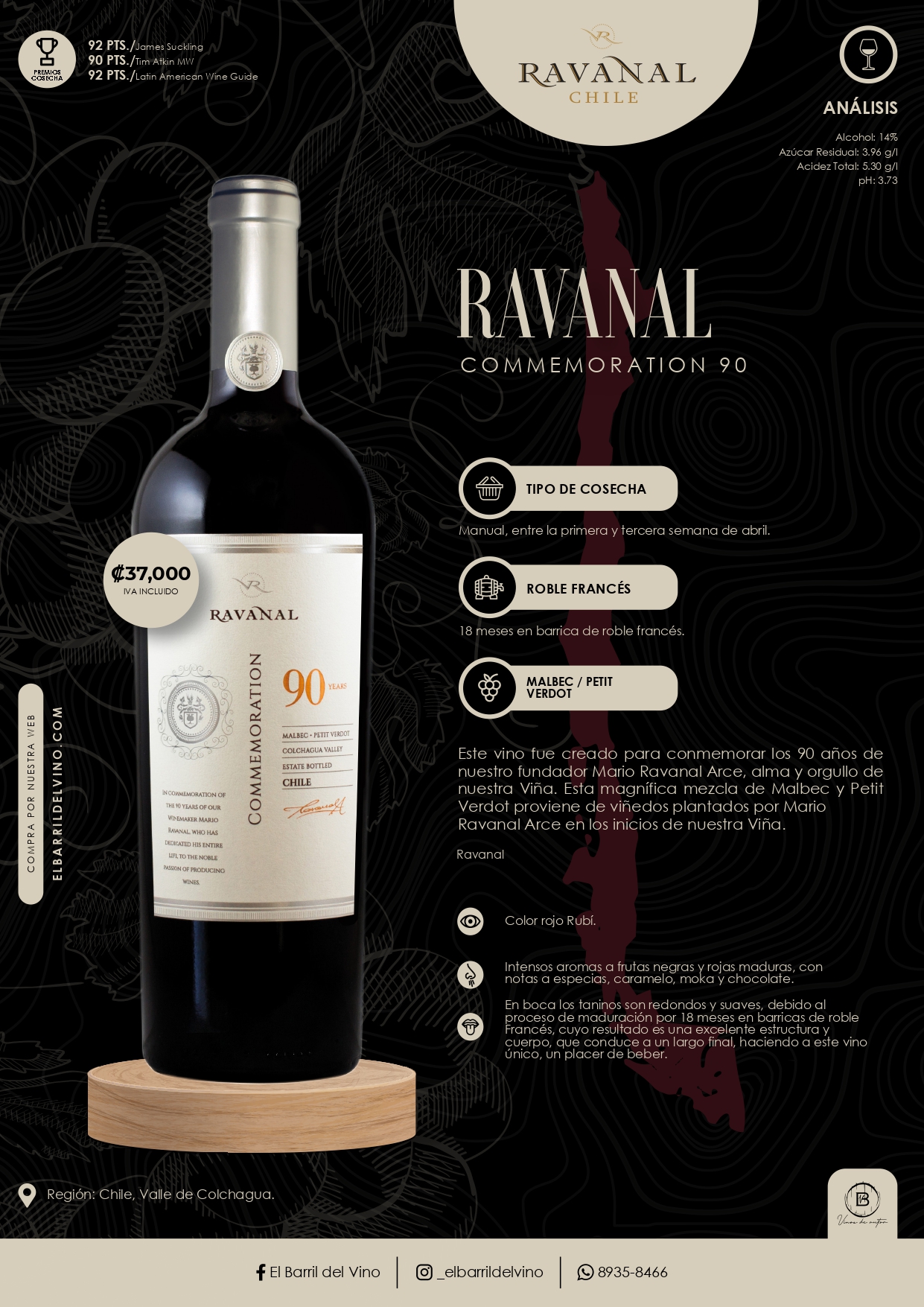 Viña Ravanal es una empresa familiar comprometida con la producción de vinos finos. Desde la cuidadosa selección manual de uvas hasta la hábil mezcla, cada botella refleja pasión y dedicación. Este Cabernet Sauvignon destaca por su elegancia, equilibrio y expresión de fruta madura, combinado con suaves notas de roble.